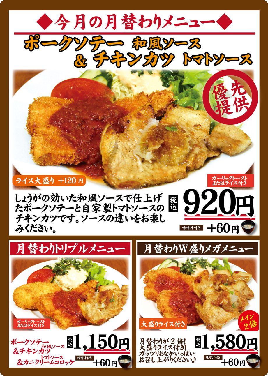 3月の月替わりメニューです来店お待ちしています月替わり1050円トリプル月替わり1350円ダブル月替わり1850円に変更しました。
